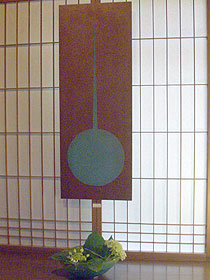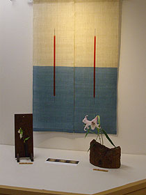 のれん、タペストリー、Tシャツ、小物などさわやかな 風野工房の染布作品と安部俊夫さんの木工の ペンダント、花入などお楽しみ下さい