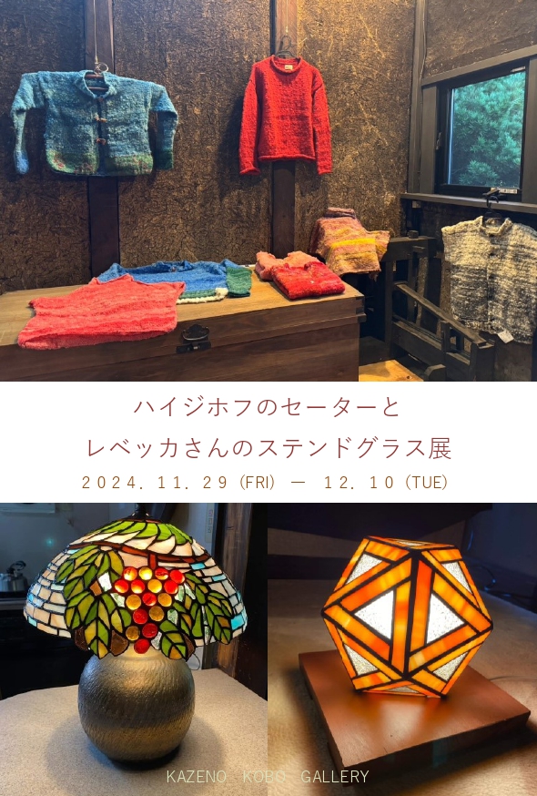 風野工房ギャラリー開設初期からの一番人気の催し「ハイジホフのセーター展」。 今年は音羽レベッカさんのステンドグラスも加わって一層楽しく会場を彩ります。 美しくぬくもりのあるお二人の作品を楽しみに、ぜひ足をお運び下さい。
