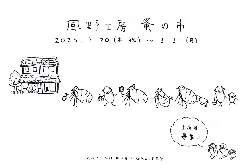 毎年恒例になります、風野工房での蚤の市を今春も開催いたします。 出品内容は、作品でも、リサイクル品でも、食品でもなんでも自由。楽しい仲間が集まって、 その日限りの市を開きます。ぜひ皆さま奮ってご出店・ご来場ください。