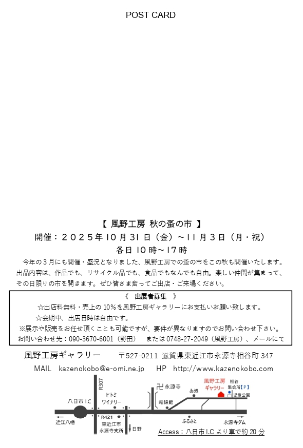 《 出展者募集 》 ☆出店料無料・売上の10%を風野工房ギャラリーにお支払いお願い致します。 ☆会期中、出店日時は自由です。 ※展示や販売をお任せ頂くことも可能ですが、要件が異なりますのでお問い合わせ下さい。 お問い合わせ先:090-3670-6001(野田) または0748-27-2049(風野工房)、メールにて